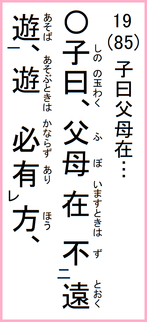 子の曰く、父母在すときは遠く遊ばず、遊ぶときは必ず方有り、