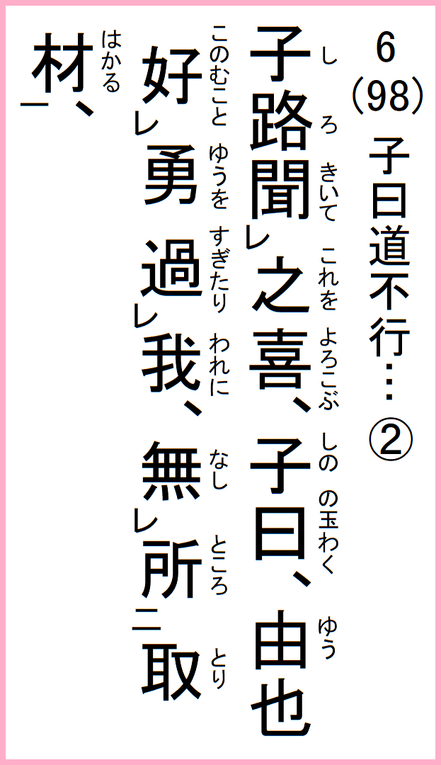 子路これを聞いて喜ぶ、子の曰く、由は勇を好むこと我に過ぎたり、取り材る所無し、