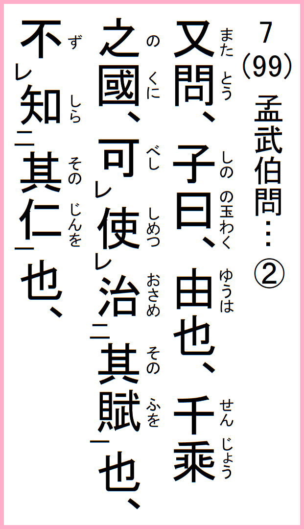 求也何如、子曰、求也、千室之邑、百乘之家、可使爲之宰也、不知其仁也、