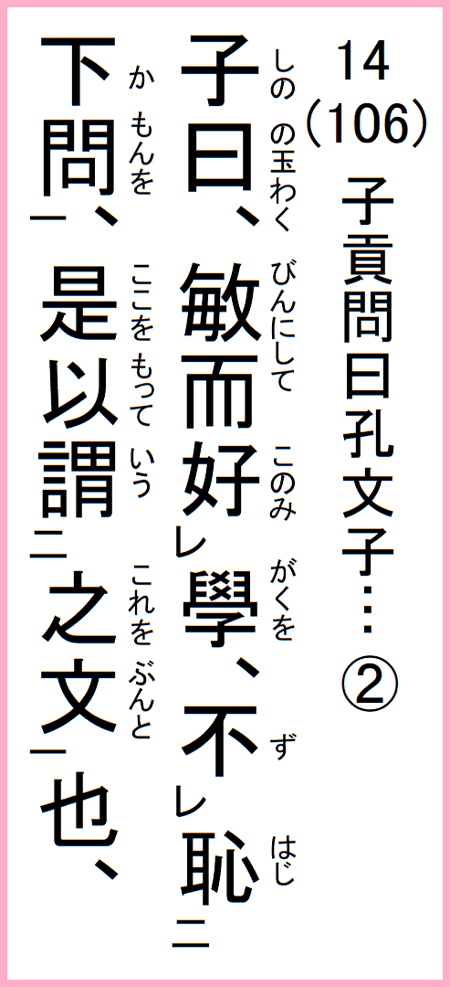 子の曰く、敏にして学を好み、下問を恥じず、是を以って之を文と謂う、
