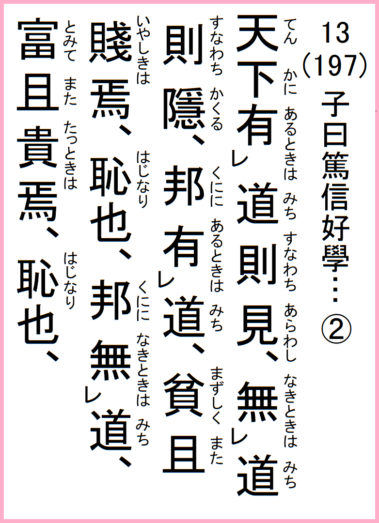 天下に道有るときは則ち見し、道無きときは則ち隠る、邦に道有るときは、貧しく且た賤しきは、恥じなり、邦に道無きときは、富て且た貴きは、恥じなり、