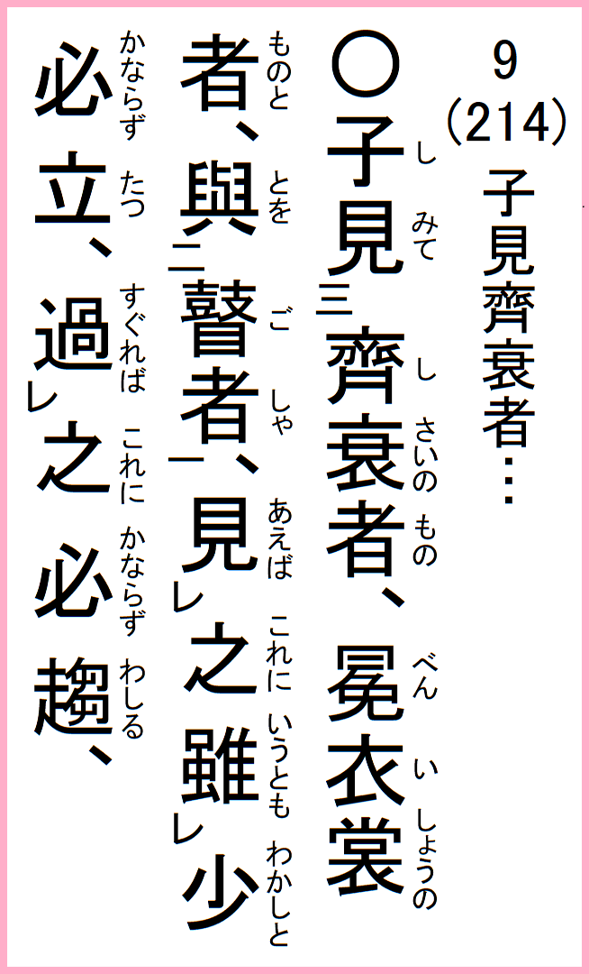 子、齊衰の者、冕衣裳の者と、瞽者とを見て、之に見えば少しと雖も必ず立つ、之に過ぐれば必ず趨る、