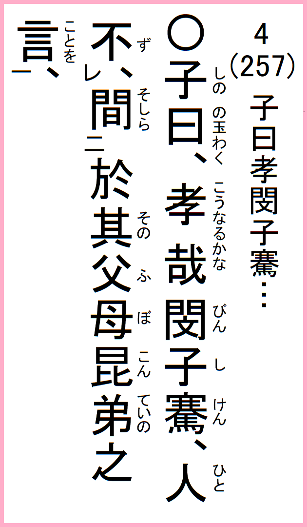 子の曰く、孝なる哉、閔子騫、人、其の父母昆弟の言を間らず、