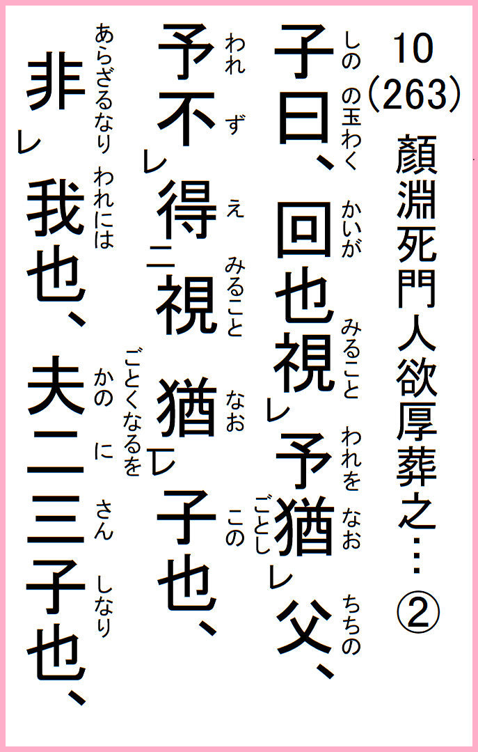 顏淵死、門人欲厚葬之、子曰、不可矣、門人厚葬之、