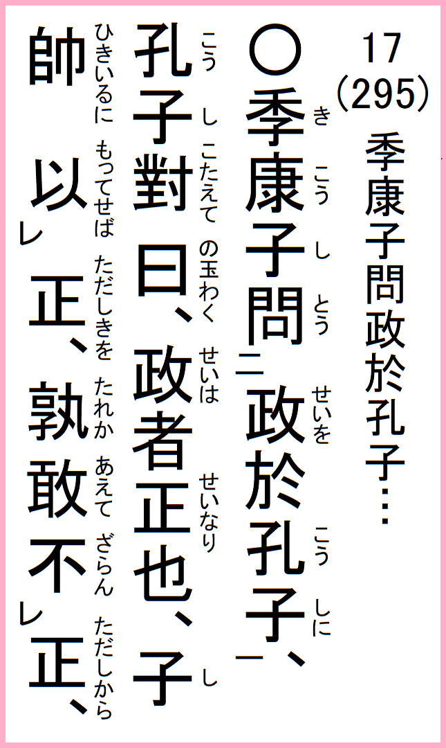 季康子問政於孔子、孔子對曰、政者正也、子帥以正、孰敢不正、