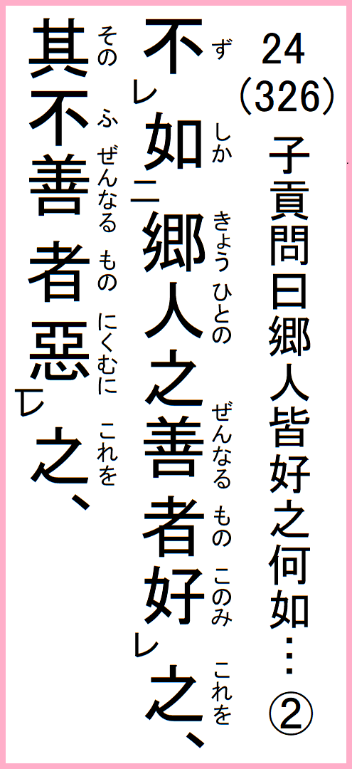 子貢問曰、郷人皆好之何如、子曰、未可也、郷人皆惡之何如、子曰、未可也、