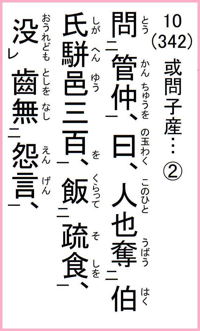 管仲を問う、曰く、この人、伯氏が駢邑三百を奪う、疏食を飯って、歯を没れども怨言無し、