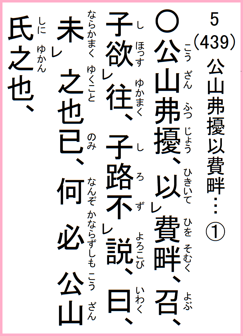 公山弗擾、費を以いて畔く、召ぶ、子、往かまく欲す、子路、説びず、曰く、之くこと未らまく已、何ぞ必ずしも公山氏に之かん、