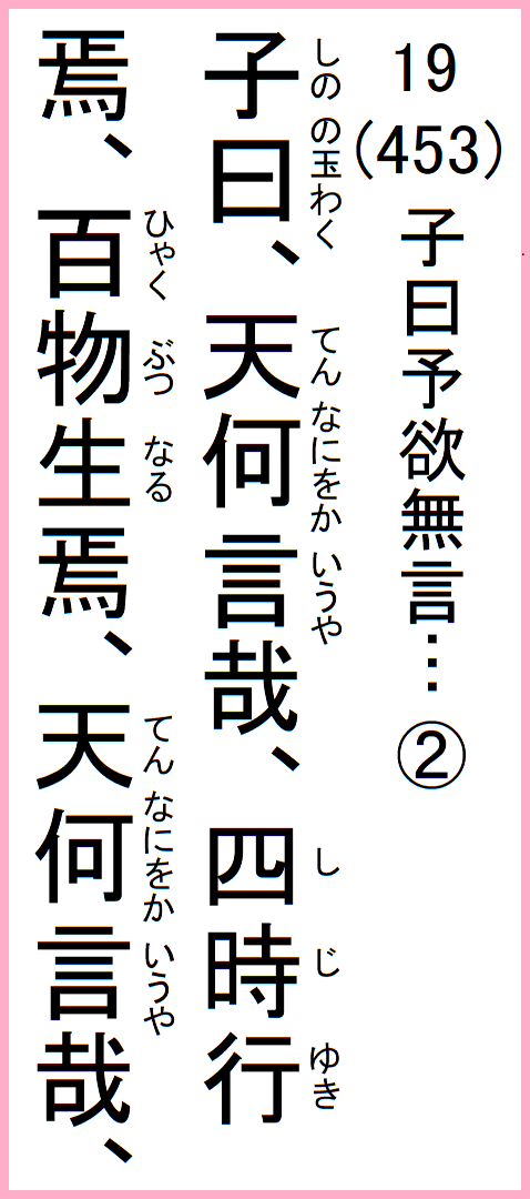 子の曰く、天、何をか言うや、四時行き、百物生る、天、何をか言うや、