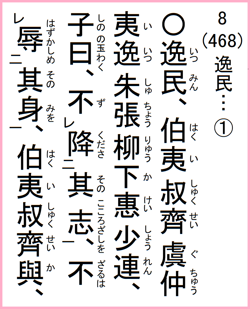漢文として楽しむ論語 微子第十八 8/11トップページ 論語序説(朱子による孔子の略歴) 學而第一 爲政第二 八佾第三 里仁第四 公冶長第五 雍也第六 述而第七 泰伯第八 子罕第九 郷黨第十 先進第十一 顔淵第十二 子路第十三 憲問第十四 衞靈公第十五 季氏第十六 陽貨第十七 微子第十八 子張第十九 堯曰第二十 微子第十八 |