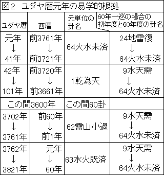 B徹底的に易学で組み立てられている☆厩済→既済が連想される では、ユダヤ暦元年=西暦紀元前3761年説の解説に入ろう。 ☆「完成された事業」という意義を帯びる「ルカ」の記述 つまり、前述の〔第三の準備作業〕にしたがうことによって、イエス誕生年=西暦元年からの六十年間(一元)、つまり西暦60年までは、序次63の「完成された事業」が該当する……ことになる。 ☆ユダヤ人の歴史の始まり=序次1 大きな計算から入る。ユダヤ暦元年は西暦紀元前3761年だから、まず、この3761年を一元の年数60で割る。すると、62元あまり41年になる。そのあまり41年をよけておいて、西暦元年から62元分の時代を遡ってみる。すると、西暦紀元前3720年となる。 ☆時代を遡って計算する残る端数の41年は、本格的に歴史が始まる前の、いわば助走期ということになり、時代を遡ると天地創造の西暦紀元前3761年にたどりつく。ただ、六十年間よりも19年少ないので一元という単位に置き換えていいのかどうか迷うが、その決着は後回しにするとして、19年間が欠落したこの41年間も一元と見立てれば、序次64の「火水未済」が巡ってくる。これには「新たなる展開」という中心的な意義がある。天地創造という大イベントにまさにピッタリではないか!次の図2を見てほしい。