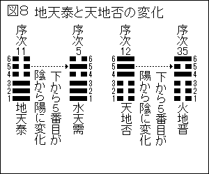序次11䷊地天泰の下から五番目が変化すると序次5䷄水天需となり、序次12䷋天地否の下から五番目が変化すると序次35䷢火地晋となる(図8参照)。