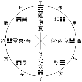 八卦と方位・季節・干支 さて、八卦の成り立ちについてはこのぐらいにして、ここからは各卦に配される事象をいくつか拾ってみよう。易がこの世の中のすべてを蔽い尽くすとされるのも、実にこの八卦の多義性によるのだ。もっとも、この世の中の全集合を八分割したのが八卦なのだから、多義で当然なのだが・・・。 八卦 方位 季節 五行 十干 十二支 ☰乾(天) 西北 金 戌亥 ☱兌(沢) 西 秋 金 庚辛 酉 ☲離(火) 南 夏 火 丙丁 午 ☳震(雷) 東 春 木 甲乙 卯 ☴巽(風) 東南 木 辰巳 ☵坎(水) 北 冬 水 壬癸 子 ☶艮(山) 東北 土 戊 丑寅 ☷坤(地) 西南 土 己 未申 ※ただし十干のうちの戊と己は、 何れの卦にも配さない、とする説もある。 これを図にすると次のようになる。