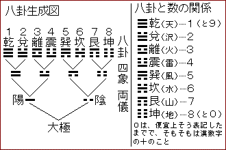 コンピュータが作られた契機になった数学の二進法や集合は、迂闊にも近代以降の理論だと思い込んでいたので、この八卦生成過程には一瞬目を疑った。しかし調べてみるとその近代数学に大きな影響を及ぼしたものこそが「易」だったのだ。 「一か八か」の同義語は「 |