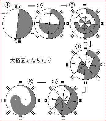 まず円を一年に擬え、冬至から夏至、夏至から冬至の二つに分ける。すると@のように、冬至の直後から夏至までの円の左側が陽、夏至の直後から冬至までの円の右側が陰となる。これが両儀に相当する。