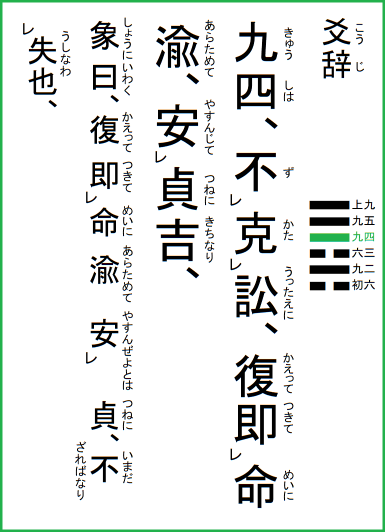 究極の易経解説 メニュー 01.乾為天 02.坤為地 03.水雷屯 04.山水蒙 05.水天需 06.天水訟 07.地水師 08.水地比 09.風天小畜 10.天沢履 11.地天泰 12.天地否 13.天火同人 14.火天大有 15.地山謙 16.雷地予 17.沢雷随 18.山風蠱 19.地沢臨 20.風地観 21.火雷噬嗑 22.山火賁 23.山地剥 24.地雷復 25.天雷无妄 26.山天大畜 27.山雷頤 28.沢風大過 29.坎為水 30.離為火 31.沢山咸 32.雷風恒 33.天山遯 34.雷天大壮 35.火地晋 36.地火明夷 37.風火家人 38.火沢睽 39.水山蹇 40.雷水解 41.山沢損 42.風雷益 43.沢天夬 44.天風姤 45.沢地萃 46.地風升 47.沢水困 48.水風井 49.沢火革 50.火風鼎 51.震為雷 52.艮為山 53.風山漸 54.雷沢帰妹 55.雷火豊 56.火山旅 57.巽為風 58.兌為沢 59.風水渙 60.水沢節 61.風沢中孚 62.雷山小過 63.水火既済 64.火水未済 |
