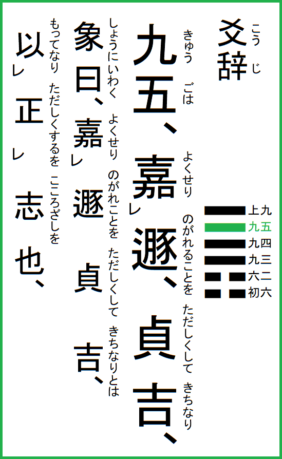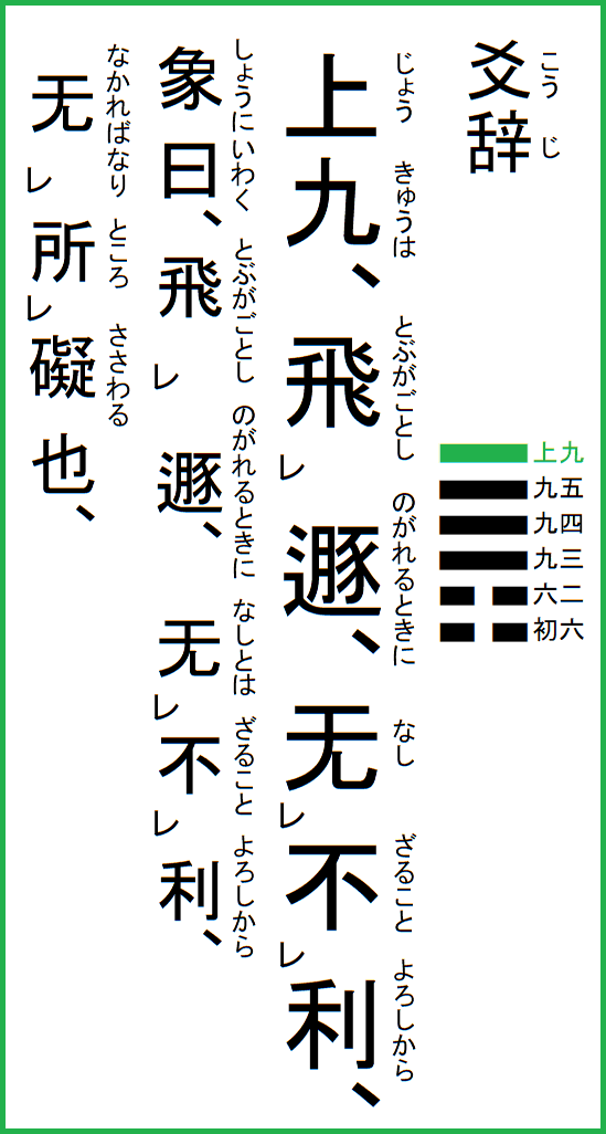 | 究極の易経解説 メニュー 01.乾為天 02.坤為地 03.水雷屯 04.山水蒙 05.水天需 06.天水訟 07.地水師 08.水地比 09.風天小畜 10.天沢履 11.地天泰 12.天地否 13.天火同人 14.火天大有 15.地山謙 16.雷地予 17.沢雷随 18.山風蠱 19.地沢臨 20.風地観 21.火雷噬嗑 22.山火賁 23.山地剥 24.地雷復 25.天雷无妄 26.山天大畜 27.山雷頤 28.沢風大過 29.坎為水 30.離為火 31.沢山咸 32.雷風恒 33.天山遯 34.雷天大壮 35.火地晋 36.地火明夷 37.風火家人 38.火沢睽 39.水山蹇 40.雷水解 41.山沢損 42.風雷益 43.沢天夬 44.天風姤 45.沢地萃 46.地風升 47.沢水困 48.水風井 49.沢火革 50.火風鼎 51.震為雷 52.艮為山 53.風山漸 54.雷沢帰妹 55.雷火豊 56.火山旅 57.巽為風 58.兌為沢 59.風水渙 60.水沢節 61.風沢中孚 62.雷山小過 63.水火既済 64.火水未済 |