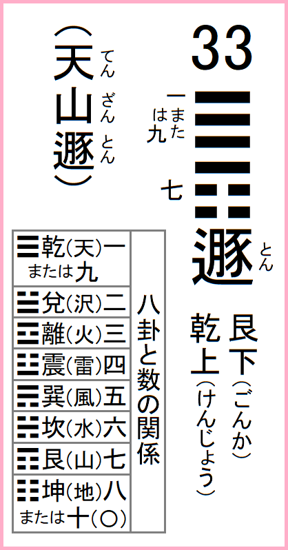 前の卦=32雷風恒 次の卦=34雷天大壮 33天山遯 てんざんとんイエス捕縛の後に「ペトロが三度否んだら鶏が鳴いた」の卦。詳細はコチラ。 八卦の