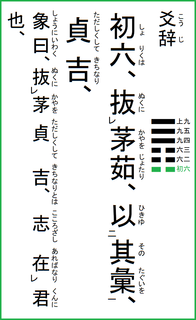 初六は、茅を抜くに茹たり、其の彙を以ゆ、貞しくして吉なり、