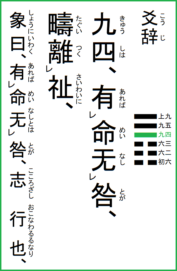 爻辞は、周の文王の子で、魯の国祖、周公旦の作と伝わり、また象辞とも言い、卦中の爻の意義を書いたものである。