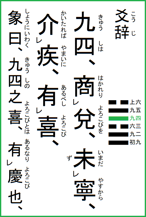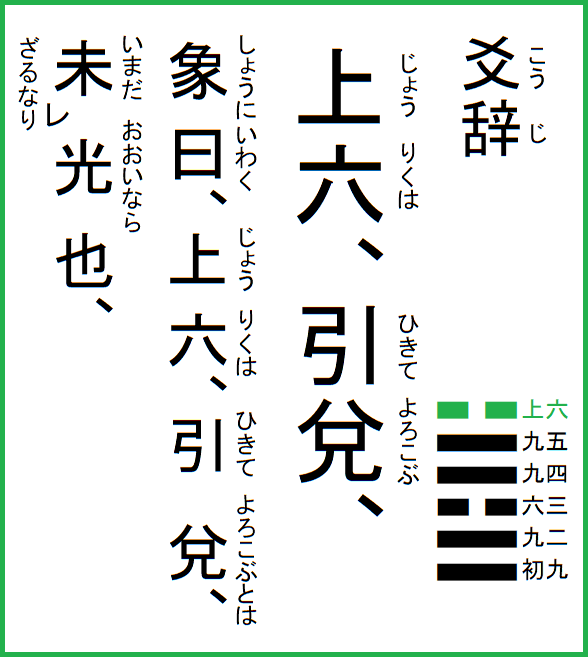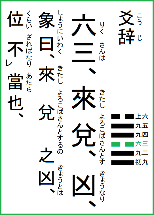 | 究極の易経解説 メニュー 01.乾為天 02.坤為地 03.水雷屯 04.山水蒙 05.水天需 06.天水訟 07.地水師 08.水地比 09.風天小畜 10.天沢履 11.地天泰 12.天地否 13.天火同人 14.火天大有 15.地山謙 16.雷地予 17.沢雷随 18.山風蠱 19.地沢臨 20.風地観 21.火雷噬嗑 22.山火賁 23.山地剥 24.地雷復 25.天雷无妄 26.山天大畜 27.山雷頤 28.沢風大過 29.坎為水 30.離為火 31.沢山咸 32.雷風恒 33.天山遯 34.雷天大壮 35.火地晋 36.地火明夷 37.風火家人 38.火沢睽 39.水山蹇 40.雷水解 41.山沢損 42.風雷益 43.沢天夬 44.天風姤 45.沢地萃 46.地風升 47.沢水困 48.水風井 49.沢火革 50.火風鼎 51.震為雷 52.艮為山 53.風山漸 54.雷沢帰妹 55.雷火豊 56.火山旅 57.巽為風 58.兌為沢 59.風水渙 60.水沢節 61.風沢中孚 62.雷山小過 63.水火既済 64.火水未済 |