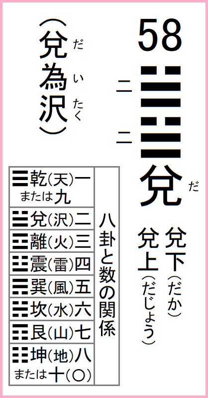 前の卦=57巽為風 次の卦=59風水渙 58兌為沢 だいたく八卦の