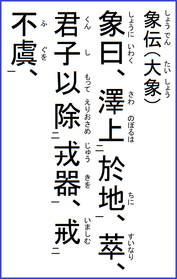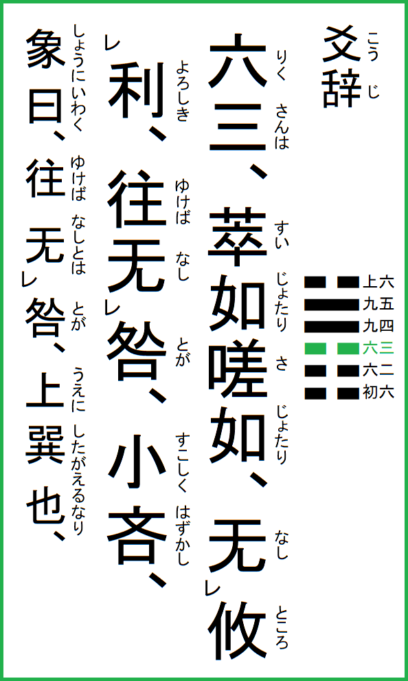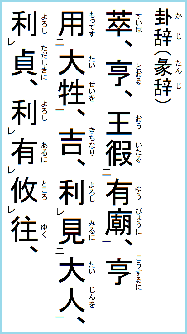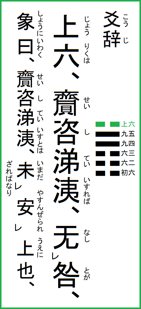 | 究極の易経解説 メニュー 01.乾為天 02.坤為地 03.水雷屯 04.山水蒙 05.水天需 06.天水訟 07.地水師 08.水地比 09.風天小畜 10.天沢履 11.地天泰 12.天地否 13.天火同人 14.火天大有 15.地山謙 16.雷地予 17.沢雷随 18.山風蠱 19.地沢臨 20.風地観 21.火雷噬嗑 22.山火賁 23.山地剥 24.地雷復 25.天雷无妄 26.山天大畜 27.山雷頤 28.沢風大過 29.坎為水 30.離為火 31.沢山咸 32.雷風恒 33.天山遯 34.雷天大壮 35.火地晋 36.地火明夷 37.風火家人 38.火沢睽 39.水山蹇 40.雷水解 41.山沢損 42.風雷益 43.沢天夬 44.天風姤 45.沢地萃 46.地風升 47.沢水困 48.水風井 49.沢火革 50.火風鼎 51.震為雷 52.艮為山 53.風山漸 54.雷沢帰妹 55.雷火豊 56.火山旅 57.巽為風 58.兌為沢 59.風水渙 60.水沢節 61.風沢中孚 62.雷山小過 63.水火既済 64.火水未済 |