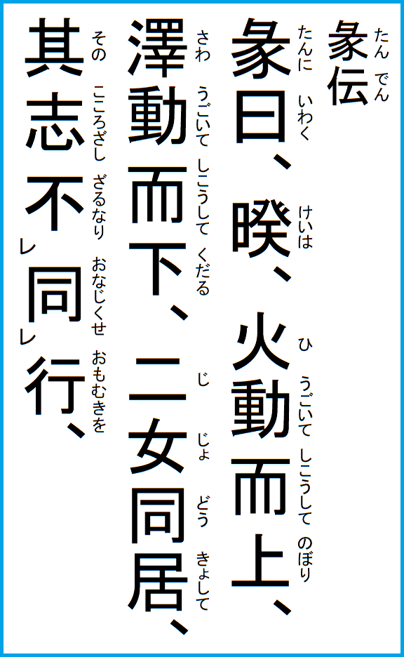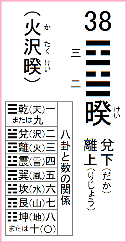 前の卦=37風火家人 次の卦=39水山蹇 38火沢睽 かたくけい