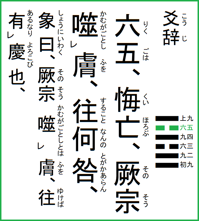 | 究極の易経解説 メニュー 01.乾為天 02.坤為地 03.水雷屯 04.山水蒙 05.水天需 06.天水訟 07.地水師 08.水地比 09.風天小畜 10.天沢履 11.地天泰 12.天地否 13.天火同人 14.火天大有 15.地山謙 16.雷地予 17.沢雷随 18.山風蠱 19.地沢臨 20.風地観 21.火雷噬嗑 22.山火賁 23.山地剥 24.地雷復 25.天雷无妄 26.山天大畜 27.山雷頤 28.沢風大過 29.坎為水 30.離為火 31.沢山咸 32.雷風恒 33.天山遯 34.雷天大壮 35.火地晋 36.地火明夷 37.風火家人 38.火沢睽 39.水山蹇 40.雷水解 41.山沢損 42.風雷益 43.沢天夬 44.天風姤 45.沢地萃 46.地風升 47.沢水困 48.水風井 49.沢火革 50.火風鼎 51.震為雷 52.艮為山 53.風山漸 54.雷沢帰妹 55.雷火豊 56.火山旅 57.巽為風 58.兌為沢 59.風水渙 60.水沢節 61.風沢中孚 62.雷山小過 63.水火既済 64.火水未済 |