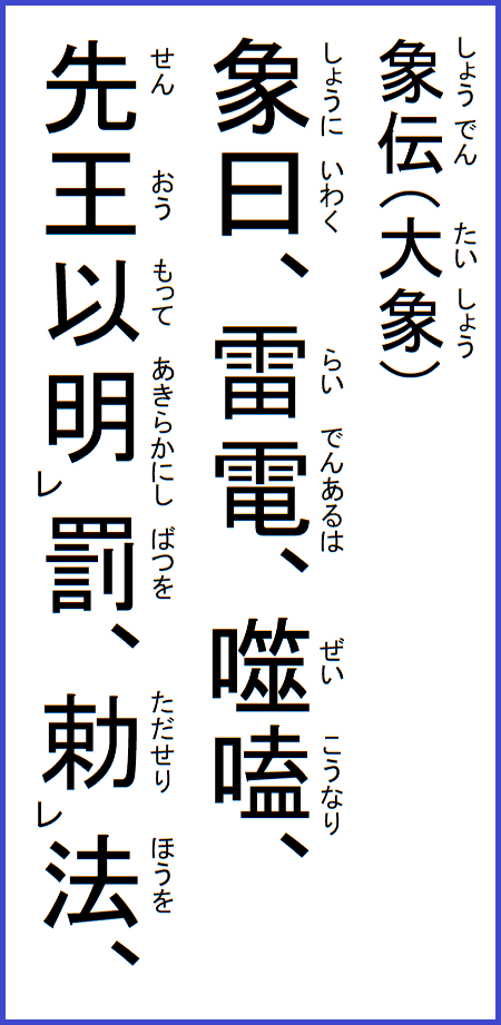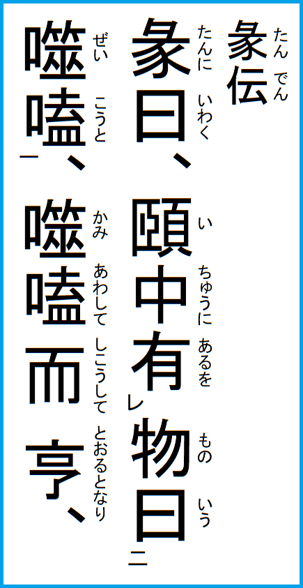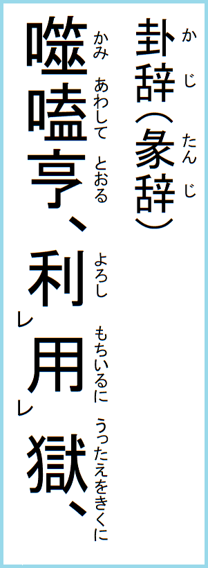 したがって、ニ爻から五爻までは、その頤中のこととして、噛み合せるという義を以って辞が付いていて、その噛むところの肉の剛柔堅軟にて、その爻の徳性象義を分別している。