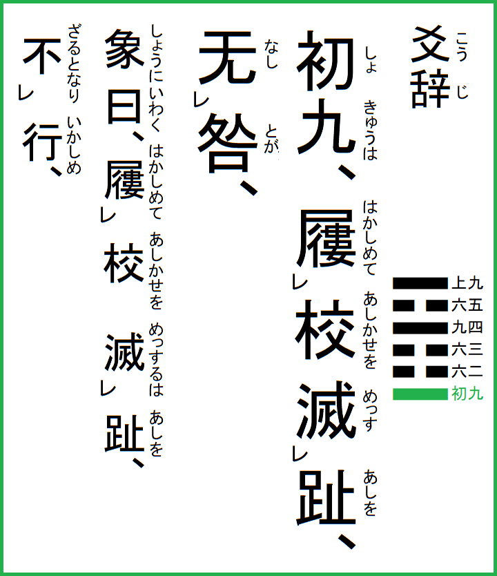 象に曰く、校を屨めて趾を滅するは、行かしめざるとなり、