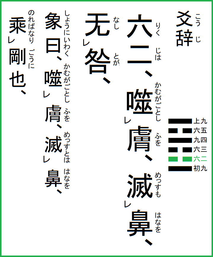 六二は、膚を噬むがごとし、鼻を滅すも咎无し、