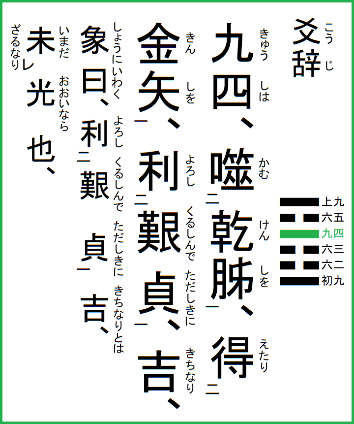 九四は、乾胏を噬む、金矢を得たり、艱しんで貞しきに利ろし、吉なり、