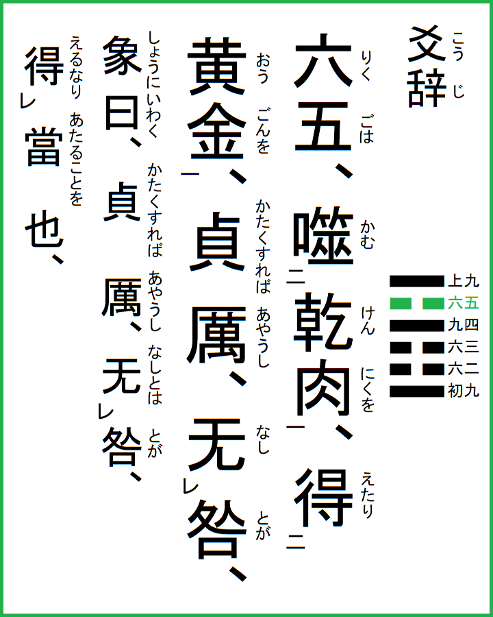 六五は、乾肉を噬む、黄金を得たり、貞くすれば獅オ、咎无し、