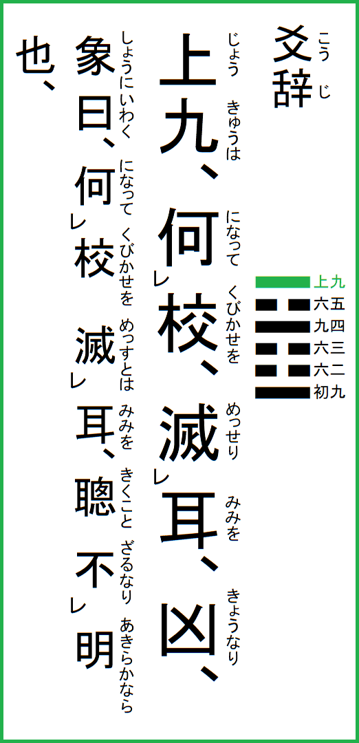 上九は、校を何って、耳を滅せり、凶なり、