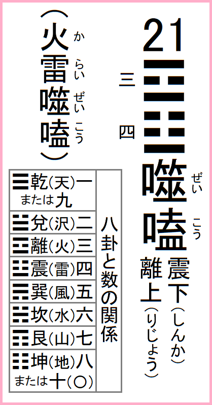 元来この卦は、頤中(口の中)に一物が有る象なので、これを齧合するという義によって、噬嗑と名付けられたものである。