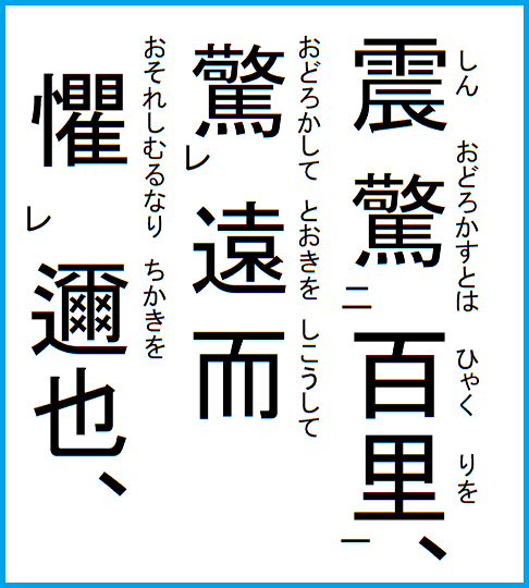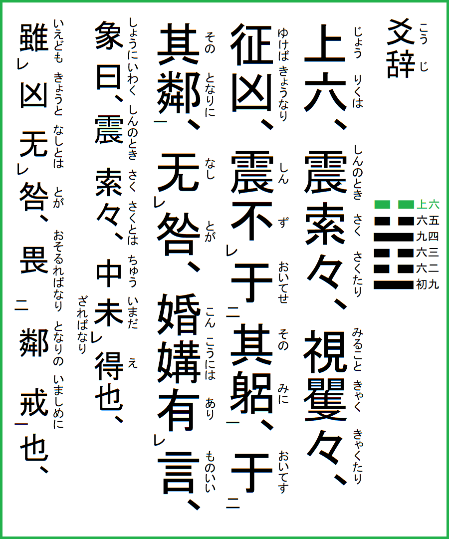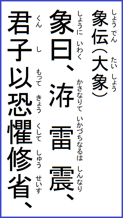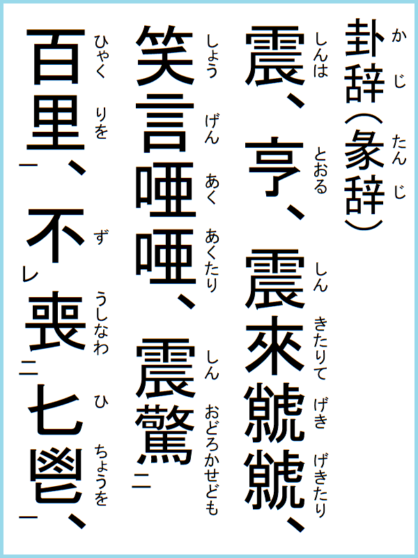前の卦=50火風鼎 次の卦=52艮為山 51震為雷 しんいらい八卦の この卦は八卦の震を重ねた形なので、八卦と同じ震と名付けられた。 |