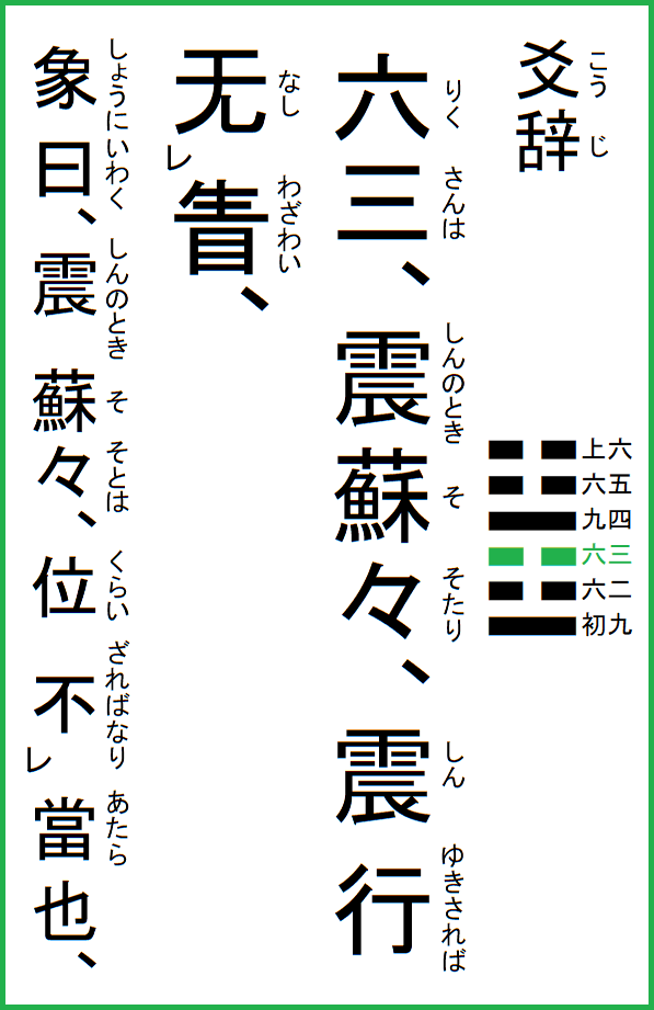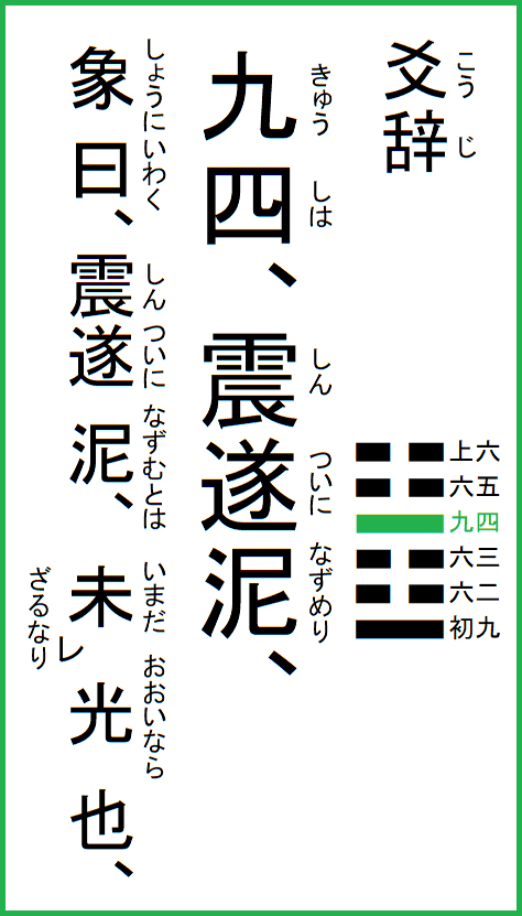 | 究極の易経解説 メニュー 01.乾為天 02.坤為地 03.水雷屯 04.山水蒙 05.水天需 06.天水訟 07.地水師 08.水地比 09.風天小畜 10.天沢履 11.地天泰 12.天地否 13.天火同人 14.火天大有 15.地山謙 16.雷地予 17.沢雷随 18.山風蠱 19.地沢臨 20.風地観 21.火雷噬嗑 22.山火賁 23.山地剥 24.地雷復 25.天雷无妄 26.山天大畜 27.山雷頤 28.沢風大過 29.坎為水 30.離為火 31.沢山咸 32.雷風恒 33.天山遯 34.雷天大壮 35.火地晋 36.地火明夷 37.風火家人 38.火沢睽 39.水山蹇 40.雷水解 41.山沢損 42.風雷益 43.沢天夬 44.天風姤 45.沢地萃 46.地風升 47.沢水困 48.水風井 49.沢火革 50.火風鼎 51.震為雷 52.艮為山 53.風山漸 54.雷沢帰妹 55.雷火豊 56.火山旅 57.巽為風 58.兌為沢 59.風水渙 60.水沢節 61.風沢中孚 62.雷山小過 63.水火既済 64.火水未済 |