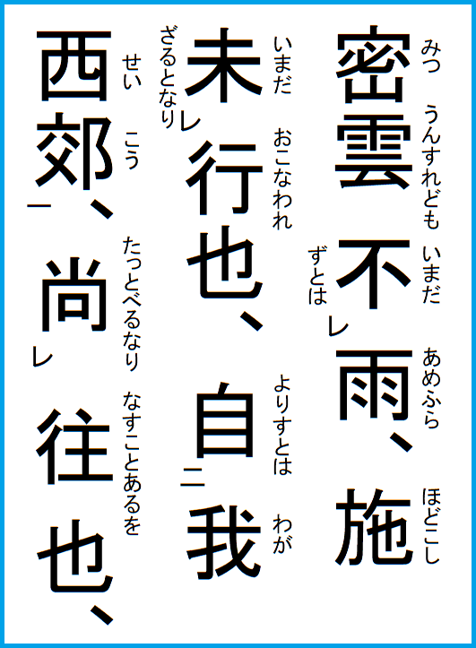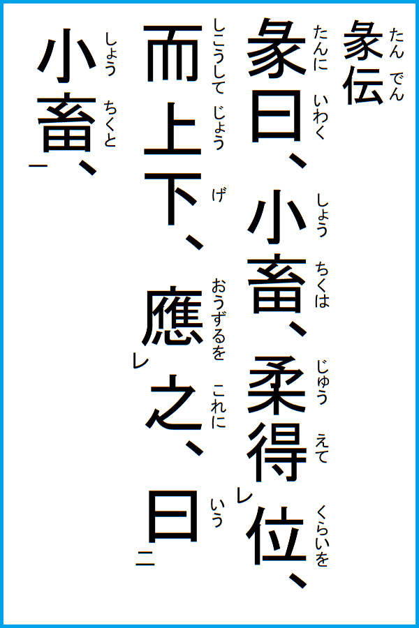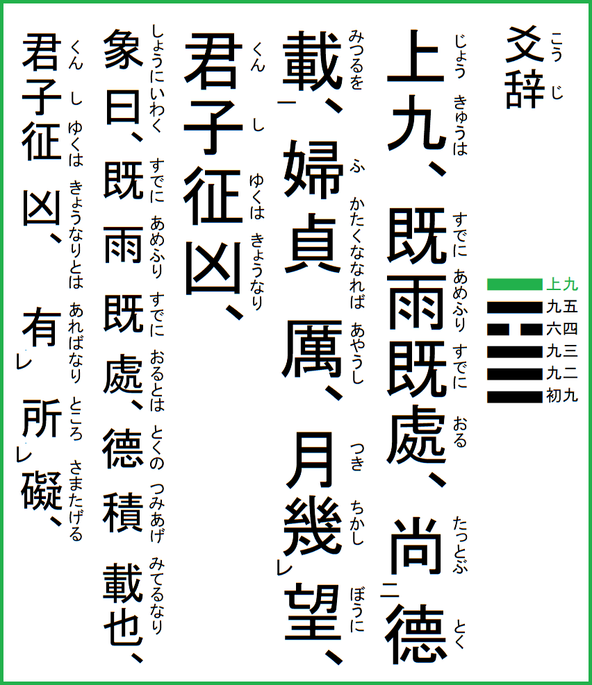 卦辞 小畜、亨、密雲不雨、自我西郊、【書き下し】 ※ 不は未と同義。 小畜は止めるということだが、一陰の六四が心を尽くして五陽を止め得れば、陰陽の情は相和し、双方の思いは亨通する。 |