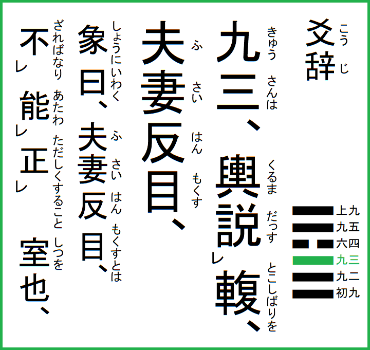 究極の易経解説 メニュー 01.乾為天 02.坤為地 03.水雷屯 04.山水蒙 05.水天需 06.天水訟 07.地水師 08.水地比 09.風天小畜 10.天沢履 11.地天泰 12.天地否 13.天火同人 14.火天大有 15.地山謙 16.雷地予 17.沢雷随 18.山風蠱 19.地沢臨 20.風地観 21.火雷噬嗑 22.山火賁 23.山地剥 24.地雷復 25.天雷无妄 26.山天大畜 27.山雷頤 28.沢風大過 29.坎為水 30.離為火 31.沢山咸 32.雷風恒 33.天山遯 34.雷天大壮 35.火地晋 36.地火明夷 37.風火家人 38.火沢睽 39.水山蹇 40.雷水解 41.山沢損 42.風雷益 43.沢天夬 44.天風姤 45.沢地萃 46.地風升 47.沢水困 48.水風井 49.沢火革 50.火風鼎 51.震為雷 52.艮為山 53.風山漸 54.雷沢帰妹 55.雷火豊 56.火山旅 57.巽為風 58.兌為沢 59.風水渙 60.水沢節 61.風沢中孚 62.雷山小過 63.水火既済 64.火水未済 |