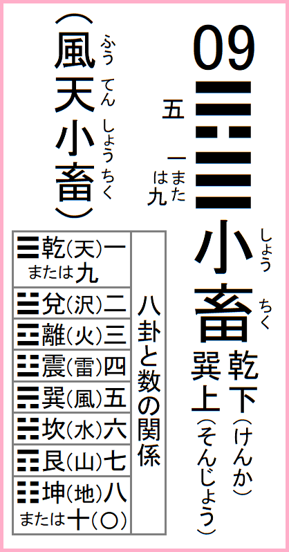 前の卦=08水地比 次の卦=10天沢履 09風天小畜 ふうてんしょうちく「旧約聖書」天地創造4日目を構成する2卦(小畜・履)のひとつ。詳細はコチラ。 八卦の