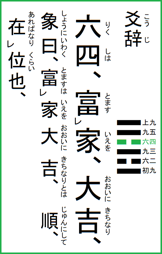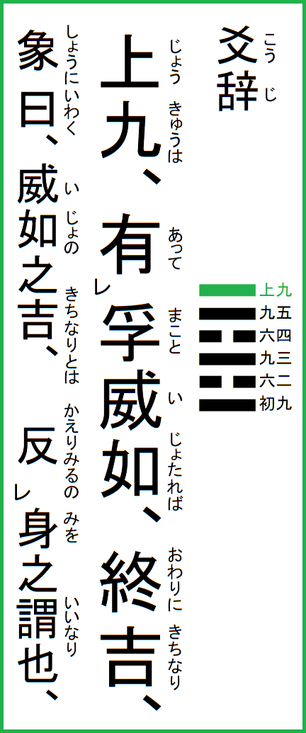 | 究極の易経解説 メニュー 01.乾為天 02.坤為地 03.水雷屯 04.山水蒙 05.水天需 06.天水訟 07.地水師 08.水地比 09.風天小畜 10.天沢履 11.地天泰 12.天地否 13.天火同人 14.火天大有 15.地山謙 16.雷地予 17.沢雷随 18.山風蠱 19.地沢臨 20.風地観 21.火雷噬嗑 22.山火賁 23.山地剥 24.地雷復 25.天雷无妄 26.山天大畜 27.山雷頤 28.沢風大過 29.坎為水 30.離為火 31.沢山咸 32.雷風恒 33.天山遯 34.雷天大壮 35.火地晋 36.地火明夷 37.風火家人 38.火沢睽 39.水山蹇 40.雷水解 41.山沢損 42.風雷益 43.沢天夬 44.天風姤 45.沢地萃 46.地風升 47.沢水困 48.水風井 49.沢火革 50.火風鼎 51.震為雷 52.艮為山 53.風山漸 54.雷沢帰妹 55.雷火豊 56.火山旅 57.巽為風 58.兌為沢 59.風水渙 60.水沢節 61.風沢中孚 62.雷山小過 63.水火既済 64.火水未済 |