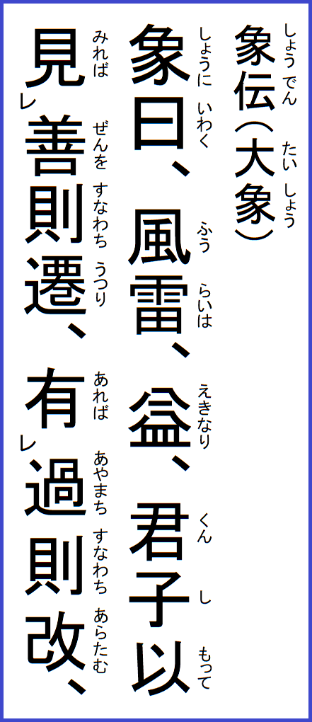 しかし、山沢損同様に、これも全体から観れば剛柔の交代のみであって、損益はない。 また、交代生卦法に従って言えば、天地否の初往き四来るは天地陰陽の二気が上り下って相交わることである。 また、震を動くとし、巽を従うとすれば、これは自分が動いて相手が従う様子である。 しかし、風も雷も形のないものであり、常に動いているものであり、損益のものである(乾の最下の陽を損したのが巽、坤の最下に陽を益したのが震である)。 なお、風雷相助け益すことから益と名付けられたのなら、雷風恒もまた雷風の組み合わせだが、こちらはなぜ、益とは名付けなかったのか。 また、天地水火の四卦にも、損益の意があるべきではないか、なぜ山沢と雷風の四卦に限って損益と名付けられたのか、という疑問もあるだろう。 |