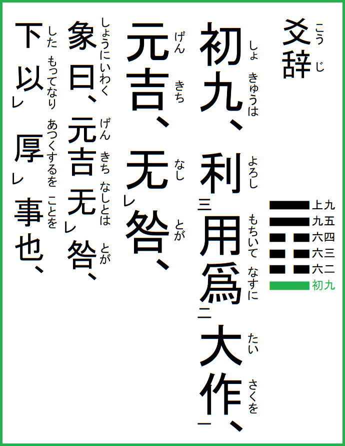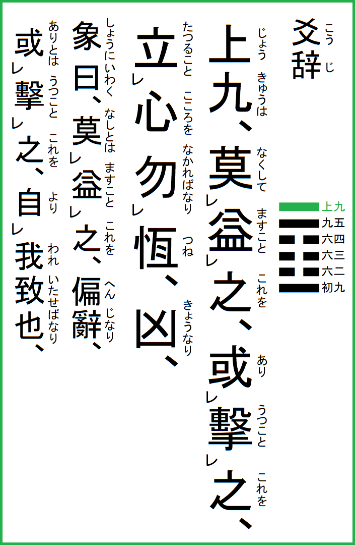 | 究極の易経解説 メニュー 01.乾為天 02.坤為地 03.水雷屯 04.山水蒙 05.水天需 06.天水訟 07.地水師 08.水地比 09.風天小畜 10.天沢履 11.地天泰 12.天地否 13.天火同人 14.火天大有 15.地山謙 16.雷地予 17.沢雷随 18.山風蠱 19.地沢臨 20.風地観 21.火雷噬嗑 22.山火賁 23.山地剥 24.地雷復 25.天雷无妄 26.山天大畜 27.山雷頤 28.沢風大過 29.坎為水 30.離為火 31.沢山咸 32.雷風恒 33.天山遯 34.雷天大壮 35.火地晋 36.地火明夷 37.風火家人 38.火沢睽 39.水山蹇 40.雷水解 41.山沢損 42.風雷益 43.沢天夬 44.天風姤 45.沢地萃 46.地風升 47.沢水困 48.水風井 49.沢火革 50.火風鼎 51.震為雷 52.艮為山 53.風山漸 54.雷沢帰妹 55.雷火豊 56.火山旅 57.巽為風 58.兌為沢 59.風水渙 60.水沢節 61.風沢中孚 62.雷山小過 63.水火既済 64.火水未済 |