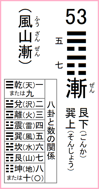 前の卦=52艮為山 次の卦=54雷沢帰妹 53風山漸 ふうざんぜん八卦の