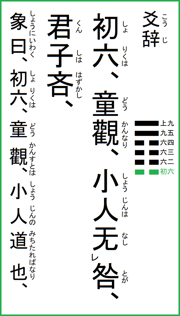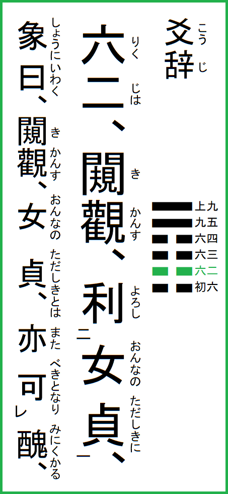 究極の易経解説 メニュー 01.乾為天 02.坤為地 03.水雷屯 04.山水蒙 05.水天需 06.天水訟 07.地水師 08.水地比 09.風天小畜 10.天沢履 11.地天泰 12.天地否 13.天火同人 14.火天大有 15.地山謙 16.雷地予 17.沢雷随 18.山風蠱 19.地沢臨 20.風地観 21.火雷噬嗑 22.山火賁 23.山地剥 24.地雷復 25.天雷无妄 26.山天大畜 27.山雷頤 28.沢風大過 29.坎為水 30.離為火 31.沢山咸 32.雷風恒 33.天山遯 34.雷天大壮 35.火地晋 36.地火明夷 37.風火家人 38.火沢睽 39.水山蹇 40.雷水解 41.山沢損 42.風雷益 43.沢天夬 44.天風姤 45.沢地萃 46.地風升 47.沢水困 48.水風井 49.沢火革 50.火風鼎 51.震為雷 52.艮為山 53.風山漸 54.雷沢帰妹 55.雷火豊 56.火山旅 57.巽為風 58.兌為沢 59.風水渙 60.水沢節 61.風沢中孚 62.雷山小過 63.水火既済 64.火水未済 |