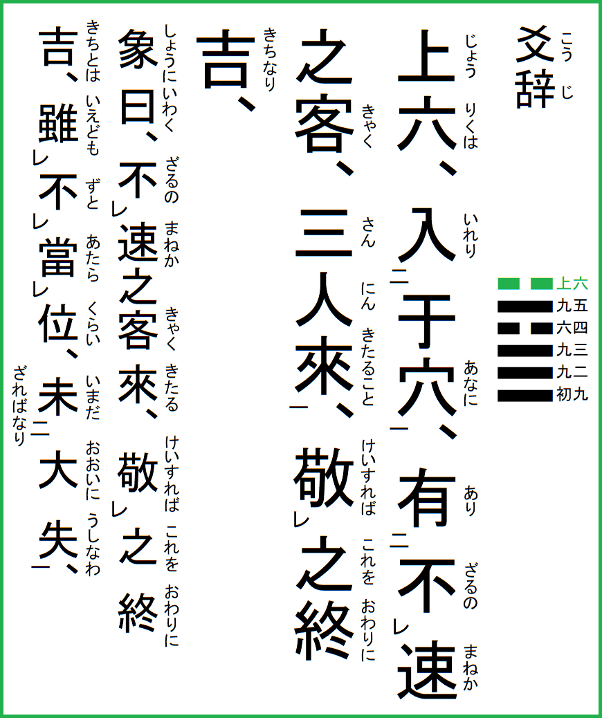 究極の易経解説 メニュー 01.乾為天 02.坤為地 03.水雷屯 04.山水蒙 05.水天需 06.天水訟 07.地水師 08.水地比 09.風天小畜 10.天沢履 11.地天泰 12.天地否 13.天火同人 14.火天大有 15.地山謙 16.雷地予 17.沢雷随 18.山風蠱 19.地沢臨 20.風地観 21.火雷噬嗑 22.山火賁 23.山地剥 24.地雷復 25.天雷无妄 26.山天大畜 27.山雷頤 28.沢風大過 29.坎為水 30.離為火 31.沢山咸 32.雷風恒 33.天山遯 34.雷天大壮 35.火地晋 36.地火明夷 37.風火家人 38.火沢睽 39.水山蹇 40.雷水解 41.山沢損 42.風雷益 43.沢天夬 44.天風姤 45.沢地萃 46.地風升 47.沢水困 48.水風井 49.沢火革 50.火風鼎 51.震為雷 52.艮為山 53.風山漸 54.雷沢帰妹 55.雷火豊 56.火山旅 57.巽為風 58.兌為沢 59.風水渙 60.水沢節 61.風沢中孚 62.雷山小過 63.水火既済 64.火水未済 |