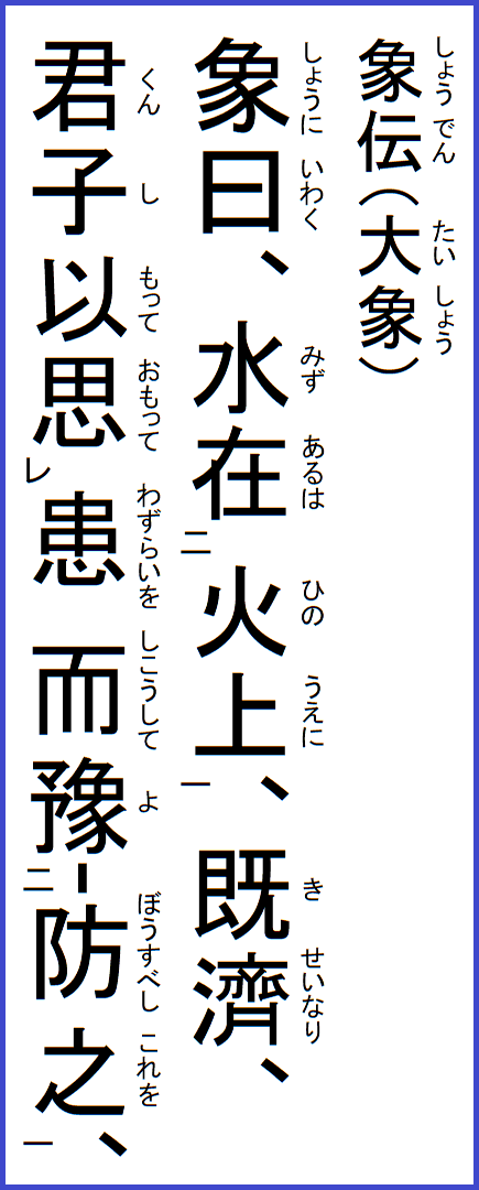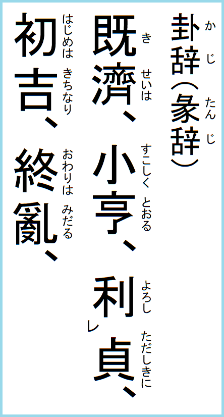 さて、六十四卦の中で、八卦が正偶匹対して相交わるのは、地天泰、沢山咸、風雷益と、この水火既済の四卦である。 その正遇匹対して相交わる四卦について、さらに仔細に検証すれば、水火既済より優れたものはない。 また、爻の交わり和することも、この水火既済に優る卦はない。 さらに水火既済は、六爻すべてに応爻も比爻あり、それぞれが正位を得ていて、二爻と五爻が共に中正の徳を具えている。 このように最も調和の取れた卦がこの水火既済なのであって、だから、すでに完成された、という意で、既済と名付けられた。 また、易位生卦法によれば、もとは火水未済から来たものとする。 |