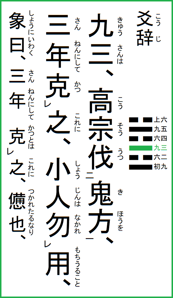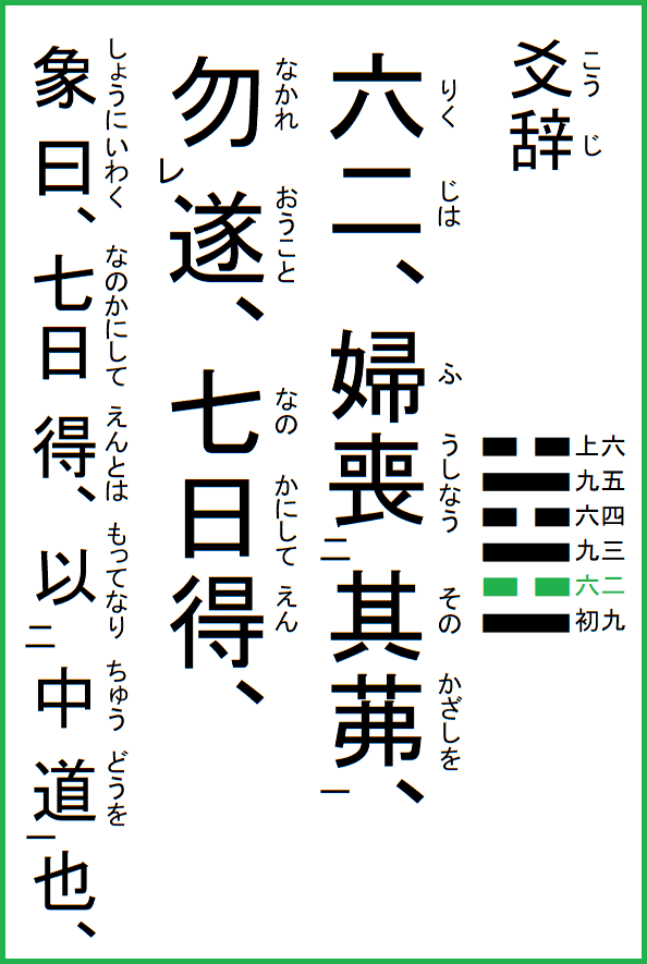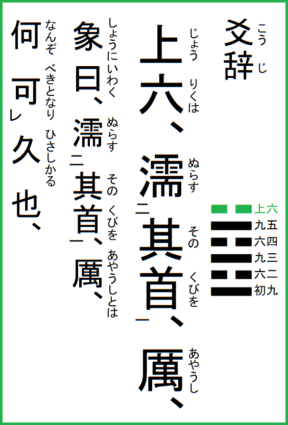 | 究極の易経解説 メニュー 01.乾為天 02.坤為地 03.水雷屯 04.山水蒙 05.水天需 06.天水訟 07.地水師 08.水地比 09.風天小畜 10.天沢履 11.地天泰 12.天地否 13.天火同人 14.火天大有 15.地山謙 16.雷地予 17.沢雷随 18.山風蠱 19.地沢臨 20.風地観 21.火雷噬嗑 22.山火賁 23.山地剥 24.地雷復 25.天雷无妄 26.山天大畜 27.山雷頤 28.沢風大過 29.坎為水 30.離為火 31.沢山咸 32.雷風恒 33.天山遯 34.雷天大壮 35.火地晋 36.地火明夷 37.風火家人 38.火沢睽 39.水山蹇 40.雷水解 41.山沢損 42.風雷益 43.沢天夬 44.天風姤 45.沢地萃 46.地風升 47.沢水困 48.水風井 49.沢火革 50.火風鼎 51.震為雷 52.艮為山 53.風山漸 54.雷沢帰妹 55.雷火豊 56.火山旅 57.巽為風 58.兌為沢 59.風水渙 60.水沢節 61.風沢中孚 62.雷山小過 63.水火既済 64.火水未済 |