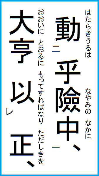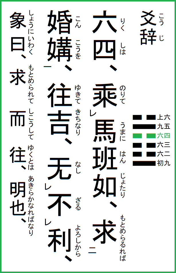究極の易経解説 メニュー 01.乾為天 02.坤為地 03.水雷屯 04.山水蒙 05.水天需 06.天水訟 07.地水師 08.水地比 09.風天小畜 10.天沢履 11.地天泰 12.天地否 13.天火同人 14.火天大有 15.地山謙 16.雷地予 17.沢雷随 18.山風蠱 19.地沢臨 20.風地観 21.火雷噬嗑 22.山火賁 23.山地剥 24.地雷復 25.天雷无妄 26.山天大畜 27.山雷頤 28.沢風大過 29.坎為水 30.離為火 31.沢山咸 32.雷風恒 33.天山遯 34.雷天大壮 35.火地晋 36.地火明夷 37.風火家人 38.火沢睽 39.水山蹇 40.雷水解 41.山沢損 42.風雷益 43.沢天夬 44.天風姤 45.沢地萃 46.地風升 47.沢水困 48.水風井 49.沢火革 50.火風鼎 51.震為雷 52.艮為山 53.風山漸 54.雷沢帰妹 55.雷火豊 56.火山旅 57.巽為風 58.兌為沢 59.風水渙 60.水沢節 61.風沢中孚 62.雷山小過 63.水火既済 64.火水未済 |